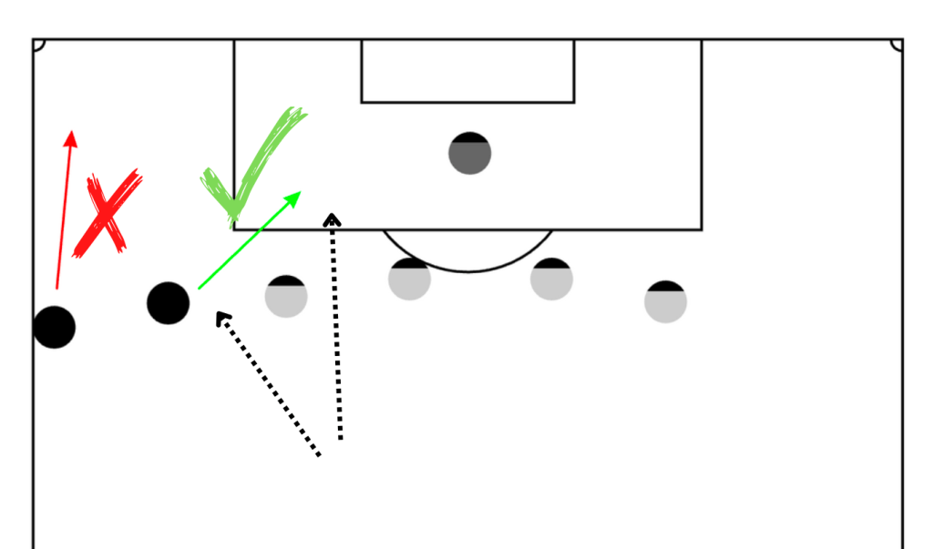 In dieser vereinfachten Grafik ist das Prinzip relativ deutlich veranschaulicht. Stehe ich in solch einer Aktion zu breit und werde angespielt, schiebt die komplette Abwehrkette durch, das Spiel wird verzögert und wir bekommen keine Tiefe ins Spiel. Stehe ich allerdings so tief wie möglich (also auf Höhe des letzten Verteidigers) und nur so breit wie nötig, ist sowohl ein scharfer Ball in die offene Spielstellung möglich, aber auch ein Schnittstellenpass zwischen AV und IV denkbar. Der Außenspieler könnte bspw. auch direkt den Weg zwischen AV und IV gehen und so noch klarer beide Gegenspieler beschäftigen und damit binden.